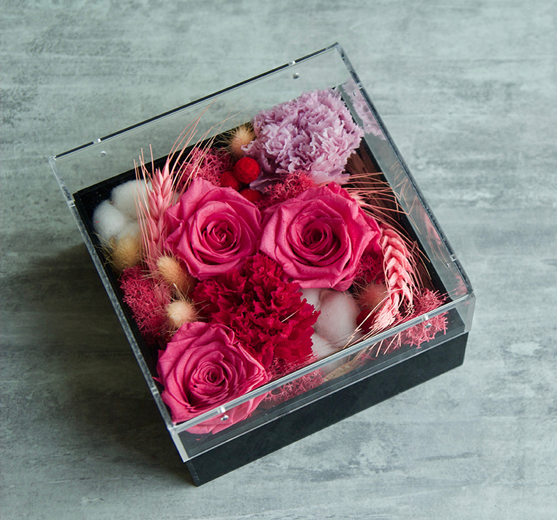 | Amazing Mom For the woman who is amazing in every way, a keepsake treasure that will never fade. Our uniquely preserved rose and carnations, vibrant and incredibly life-like, will maintain its elegance for years to come. Set in a beautiful clear acrylic cube, they are the perfect tabletop accent. Preserved flowers are 100% natural products that have undergone a preservation process with no need for water or sunlight. Price : RM 350.00 (As shown) |