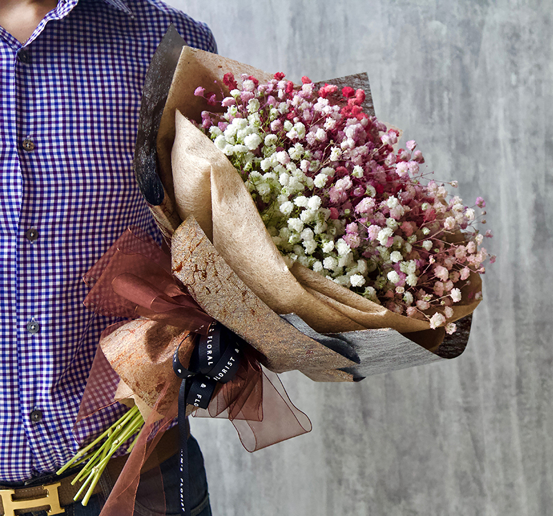 | Mum In A Million A cloud of rainbow coloured baby’s breath are artistically hand-tied with textured papers and wrappers, finished with a simple bow. The perfect gift for mum, who really is one in a million. Price : RM 250.00 (As shown) |