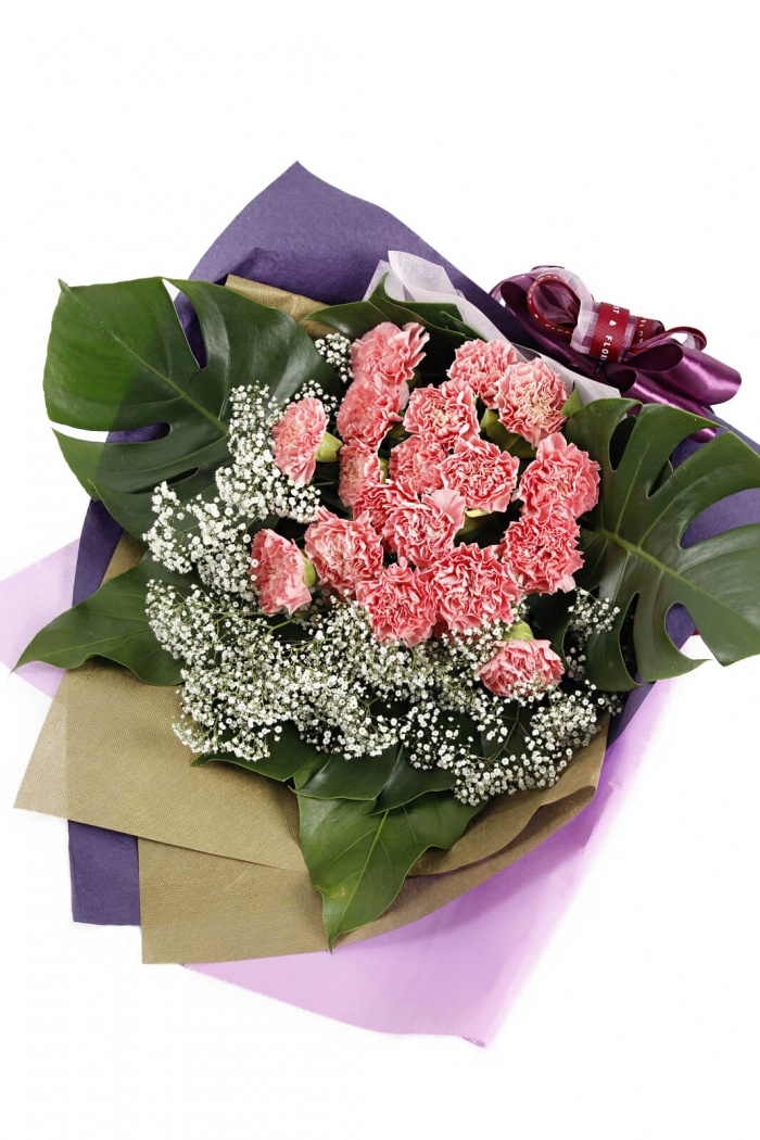 A truly original way to make a lasting and sweet impression, this charming bouquet of 18 long-stem pink carnations is beautifully designed by our expert florists. Perfect for birthdays, anniversaries, thank yours — just about any special occasion.