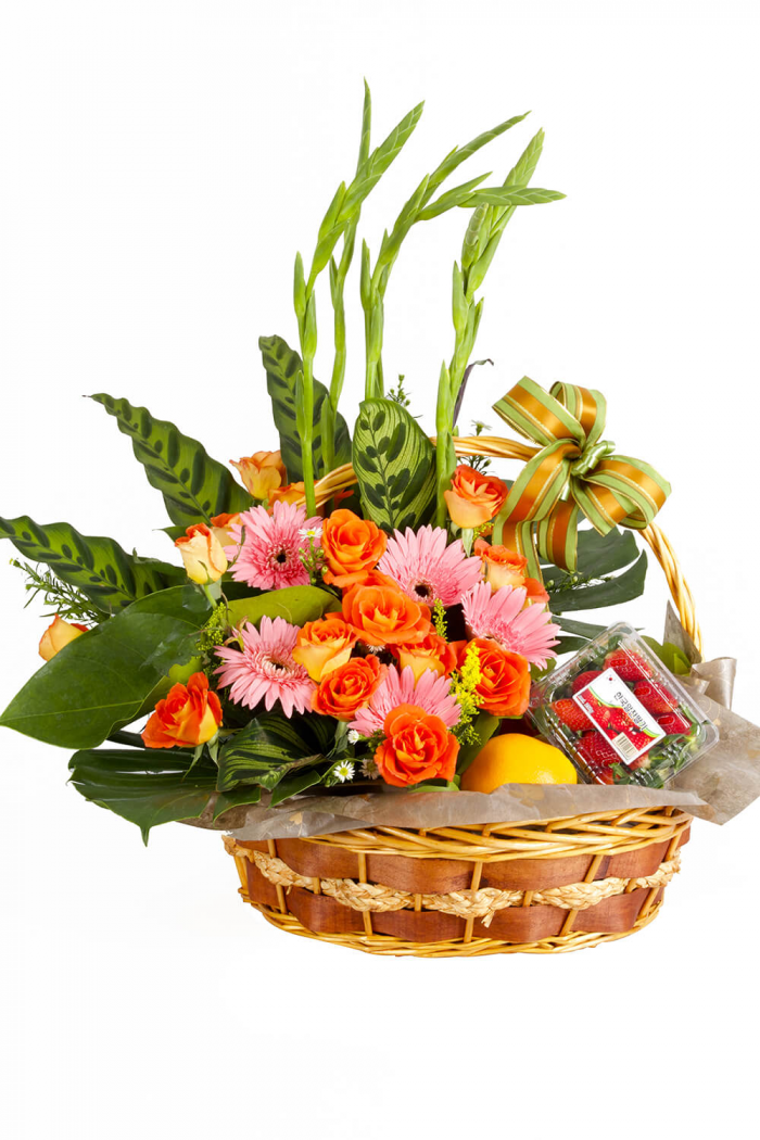 • What better way to send your best wishes to your loved ones with this delicious basket of assorted seasonal fruits. It even comes with a beautiful arrangement of orange roses and baby pink gerberas; perfect for families, business associates or hostesses.