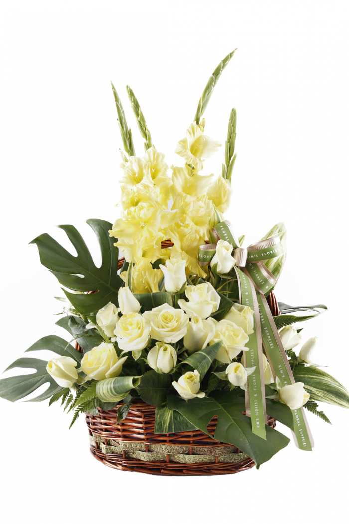 • Make it a sunshine-filled day with this gorgeous arrangement of lemon yellow gladiolus and white roses. These bright coloured blooms add sweetness and cheer to every celebration.