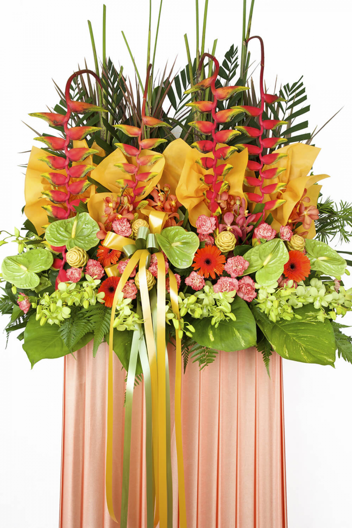 - Bright and vibrant colours symbolizes good fortune and joy. Wish your recipient prosperity and success in their new business venture with this auspicious standing arrangement of heliconias, anthuriums, carnations, orchids, gerberas and assorted foliages.