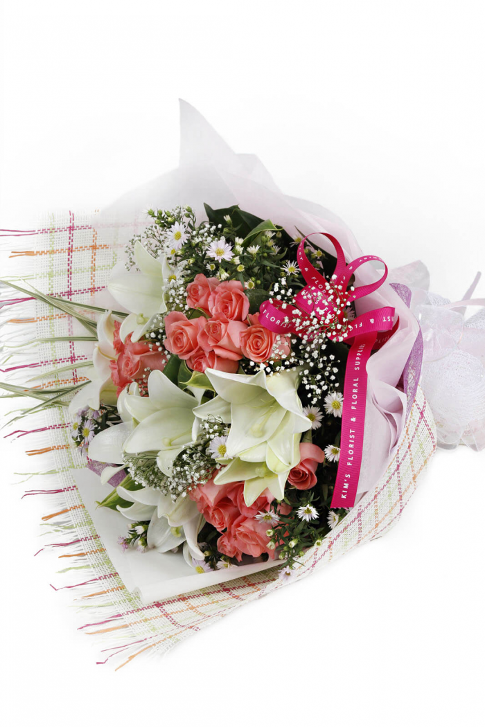 A shining example of sugar and everything nice. That’s our sweet bouquet of pink roses and white lilies, gathered by hand artistically with assorted papers and ribbons.