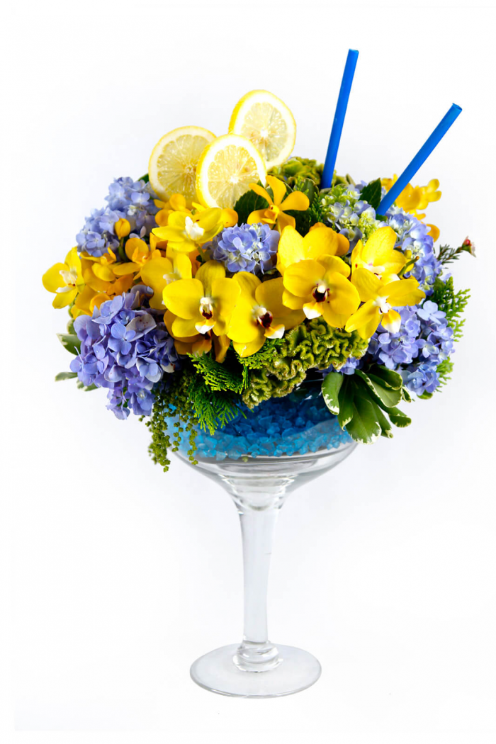 - Fresh. Flirty. Fabulous this stylish, hand-designed arrangement of orchids, hydrangeas and celosias gets the party started with a touch of lemon perfection. Designed in an oversized wineglass vase, its the perfect way to make any hour a happy one.