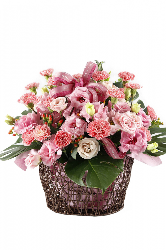 Send happy smiles with our fresh pink bouquet! This gorgeous arrangement is beaming with pink carnations, eustomas and roses. Hand-crafted in a willow basket, it makes a dainty birthday gift or party centerpiece.
