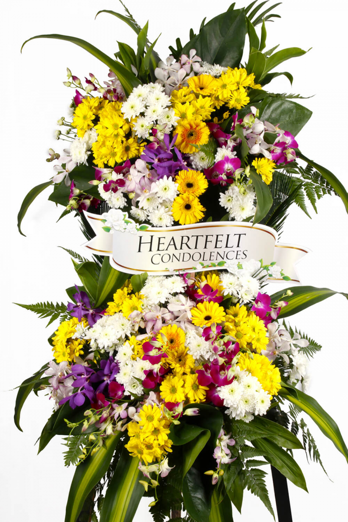 - Crafted from mixed coloured blooms, our tasteful standing arrangement is a thoughtful gesture of your care and concern in this time of sorrow. Hand-gathered with the freshest roses, mums, gerberas and more, it’s a beautiful expression of all the love in your heart as well as a touching way to remember a loved one who has passed.