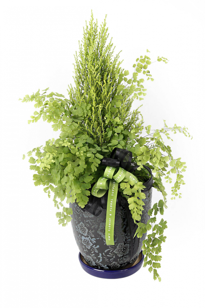 - Express yourself perfectly with this luscious maiden hair fern and mini pine tree. Our expert floral designers artistically arrange these green beauties in a hand-painted ceramic pot to create an attractive indoor garden gem.