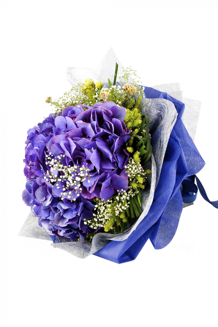• We admit it, we’re crazy about hydrangeas - and we bet they’ll be, too! Purple hydrangeas, wild flowers and assorted greens are hand-crafted with decorative wrappers, perfect for any happy celebration.