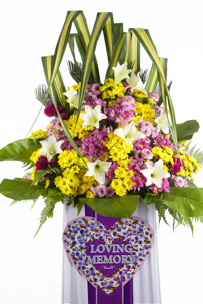 - Arranged with the freshest pom-poms, madonna lilies and assorted foliages, this tasteful standing arrangement is a simple gesture of your concern. Beautifull crafted by our florists, it’s a memorable tribute for family, friends, or business associates.
