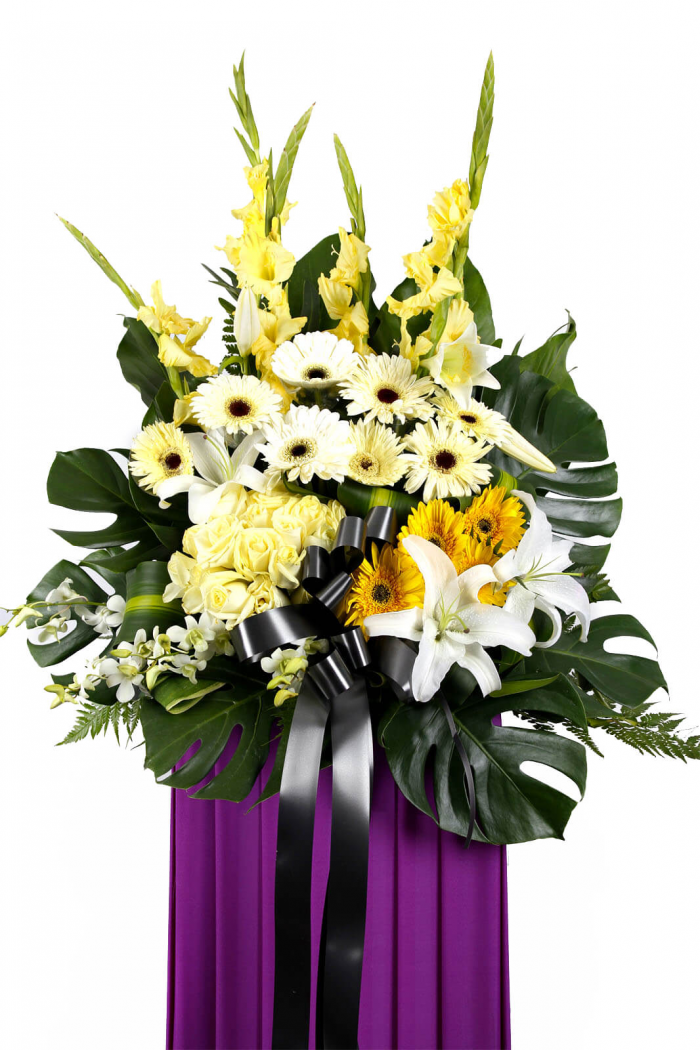 - It can be difficult to find the perfect way to express your care and concern during times of sorrow. Artistically arranged by our expert florists using fresh, beautiful yellow and white flowers, this standing arrangement is a gentle way to convey your condolences.
