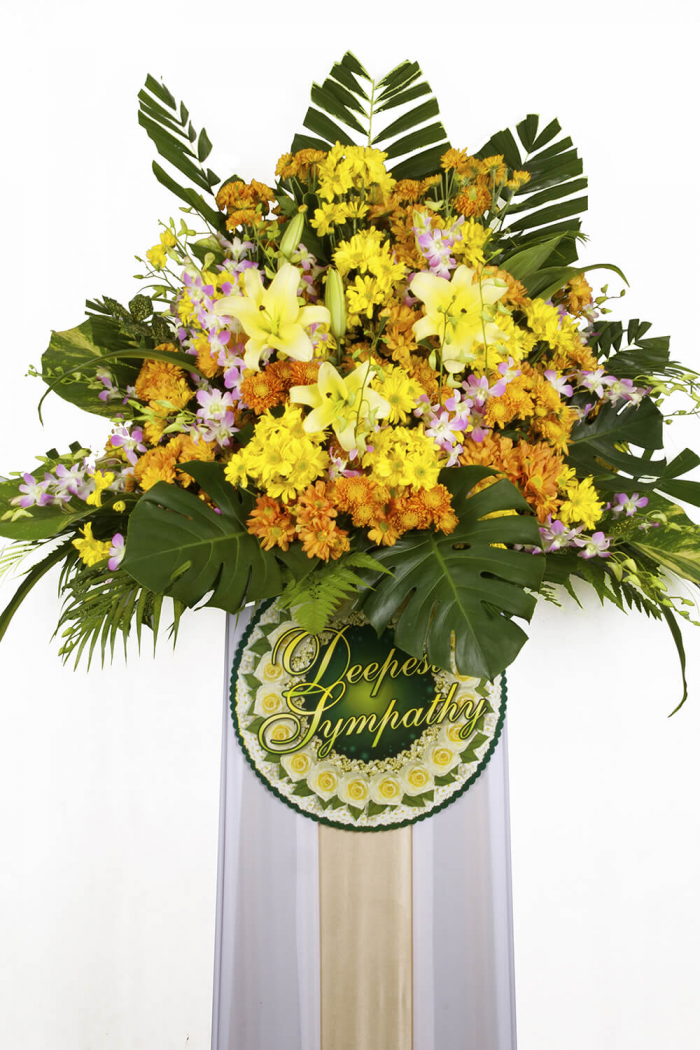 - Gathered fresh with pom-poms, lilies, dendrobium orchids and assorted foliages, this beautifully crafted standing arrangement is a tasteful gesture of your sympathy and condolences. Appropriate for family, friends or business associates to send directly to the funeral home.